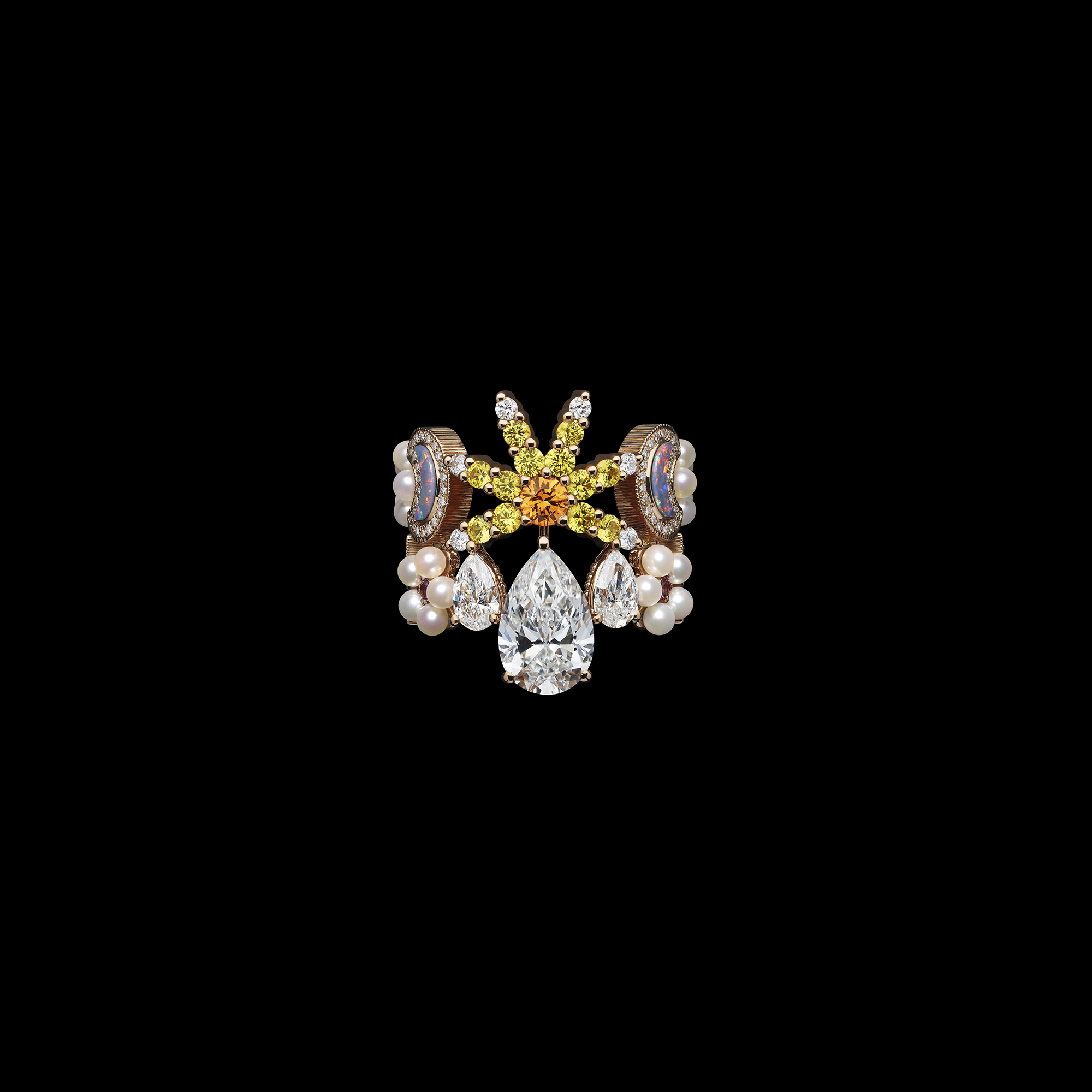One of the collection’s highlights, Soleil Céleste, pays tribute to Christian Dior’s fascination with astrology and divinatory arts. Yellow diamonds mingle with star and moon motifs and black opal doublets mounted on turquoise. The doublet technique, introduced last year, layers an opalescent base beneath black opal, intensifying its depth and blue play of colour. Several elements are transformable: the bracelet converts into a choker, and the brooch can be worn in the hair, adding movement and versatility.