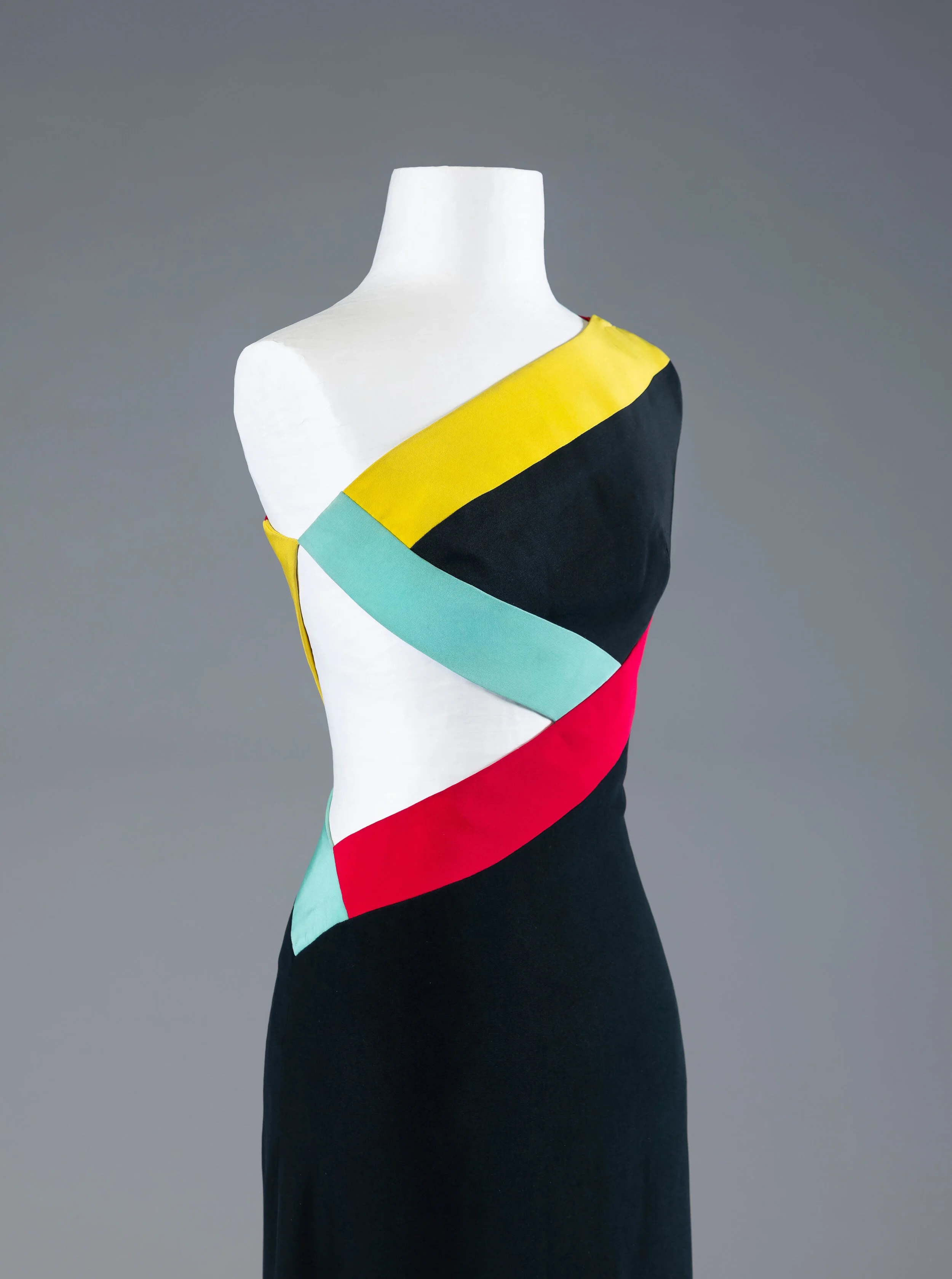 Madame Grès, black evening gown with multicoloured inserts, artificial silk, crêpe de chine, A/W 1967. Photo: Staatliche Museen zu Berlin, Kunstgewerbemuseum / David von Becker