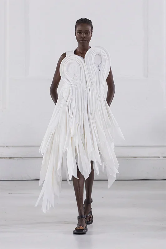 Traoré’s path helps explain why this framing matters. Born in Paris in 1985 to Malian parents and raised in Villiers-sur-Marne, he didn’t inherit an atelier or a lineage. After studying at Mod’Art and working backstage at the Paris Opera, he launched his label in 2017. But it was the founding of Les Ateliers Alix in 2015 that truly set his course. The school teaches haute-couture techniques — embroidery, tailoring, the disciplined architecture of construction — to students who rarely gain access to such training. It isn’t outreach attached to a luxury brand; it is the core of his practice, craft passed hand to hand.