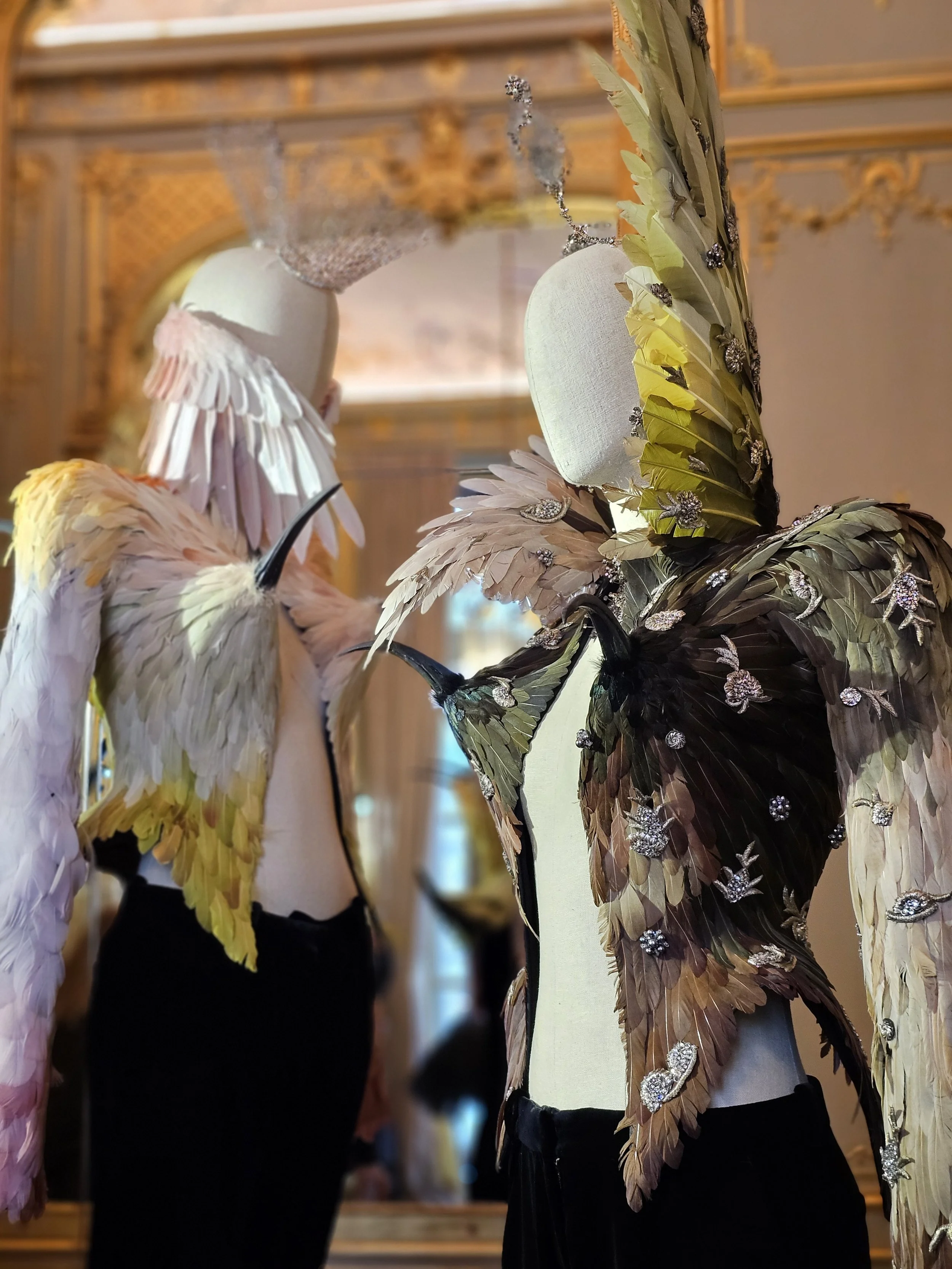 Jackets rose in wing-like collars or sculpted tails; gowns floated in layers of tulle and crin. Some feathers were real, others hand-painted silk. Pearls, crystals, and resin punctuated surfaces, sometimes as subtle glimmers, other times as sculptural flourishes: a bird’s eye here, a scorpion stinger there. Gloves, accessories, and even organza spikes became part of the layering, reinforcing the sense of motion. Each motif emphasized movement over literalism.